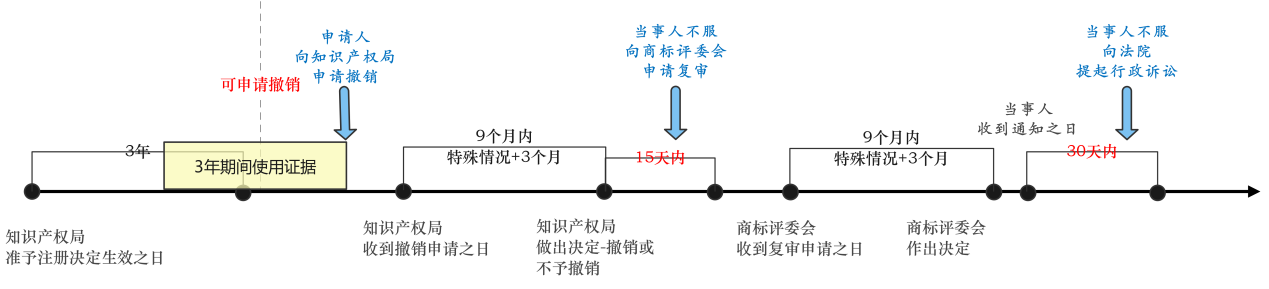 【商标注册满3年后,申请人向知识产权局申请撤销→知识产权局收到申请后要求申请人2个月内答辩并在9个月内(特殊情况可延长 3 个月)作出撤销或不予撤销决定→当事人收到通知之日起 15 天内向商标评委会申请复审→商标评委会收到复审申请 9 个月内作出决定(特殊情况可延长 3 个月)→当事人不服可在 30 天内向法院提起行政诉讼】