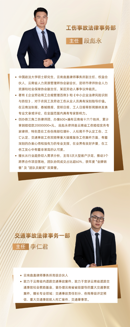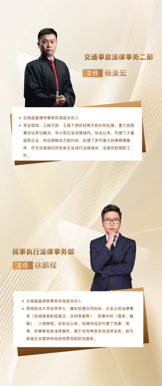 随着法律服务市场需求向精细化、专业化深度演进,为更好地回应客户多元法律诉求,强化各业务领域核心竞争力,云南曲直律师事务所经过审慎调研与决策,在原有十二个法律事务部的坚实基础上,正式增设四大专业法律事务部——工伤事故法律事务部、交通事故法律事务部、民事执行法律事务部、商业保险法律事务部。